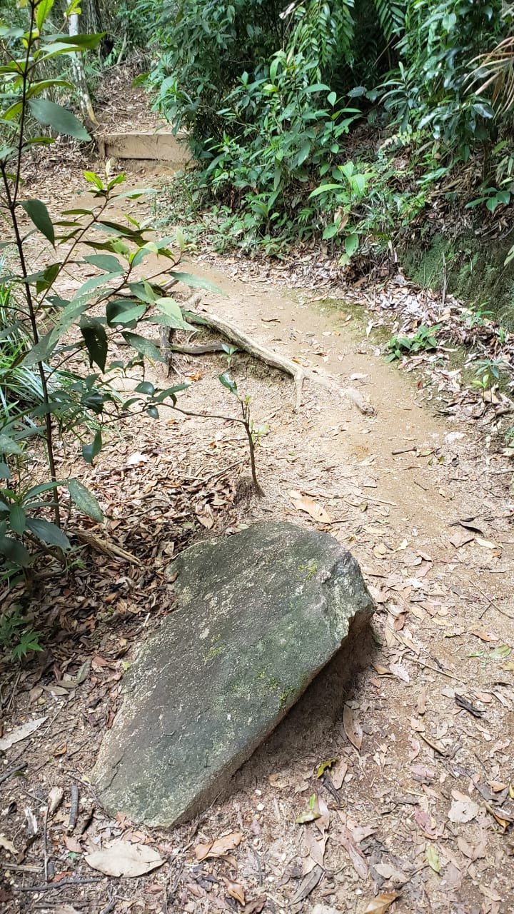Rocha que marca a saída á direita para a trilha que chega na base da via.