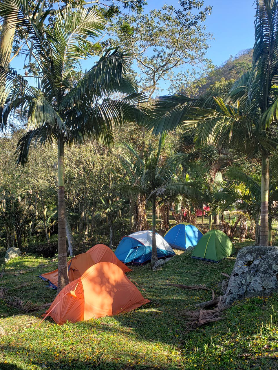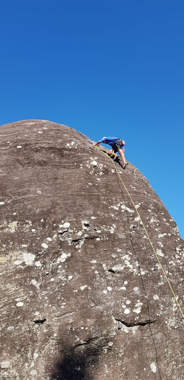 O dia estava muito quente e o sol estava forte, o que nos fazia a todo momento pensar na piscina. Por isso, após um tempo de relaxamento e algumas fotos, optamos por descer cedo. A descida foi bem tranquila, sem muito o que pontuar. Por volta de 12:20 estávamos de volta ao refúgio para aproveitar o resto da tarde. E assim fizemos. Depois do almoço rolou mais piscina, brincadeiras e até uma escalada na rocha que dá forma à piscina natural do refúgio. Essa escalada parece fácil, mas não é. Foi legal demais. No fim, montei até um rapel para alguns participantes não experientes brincarem. Nessa hora, pude sentir o quanto evolui nos últimos meses com o curso do CEB.