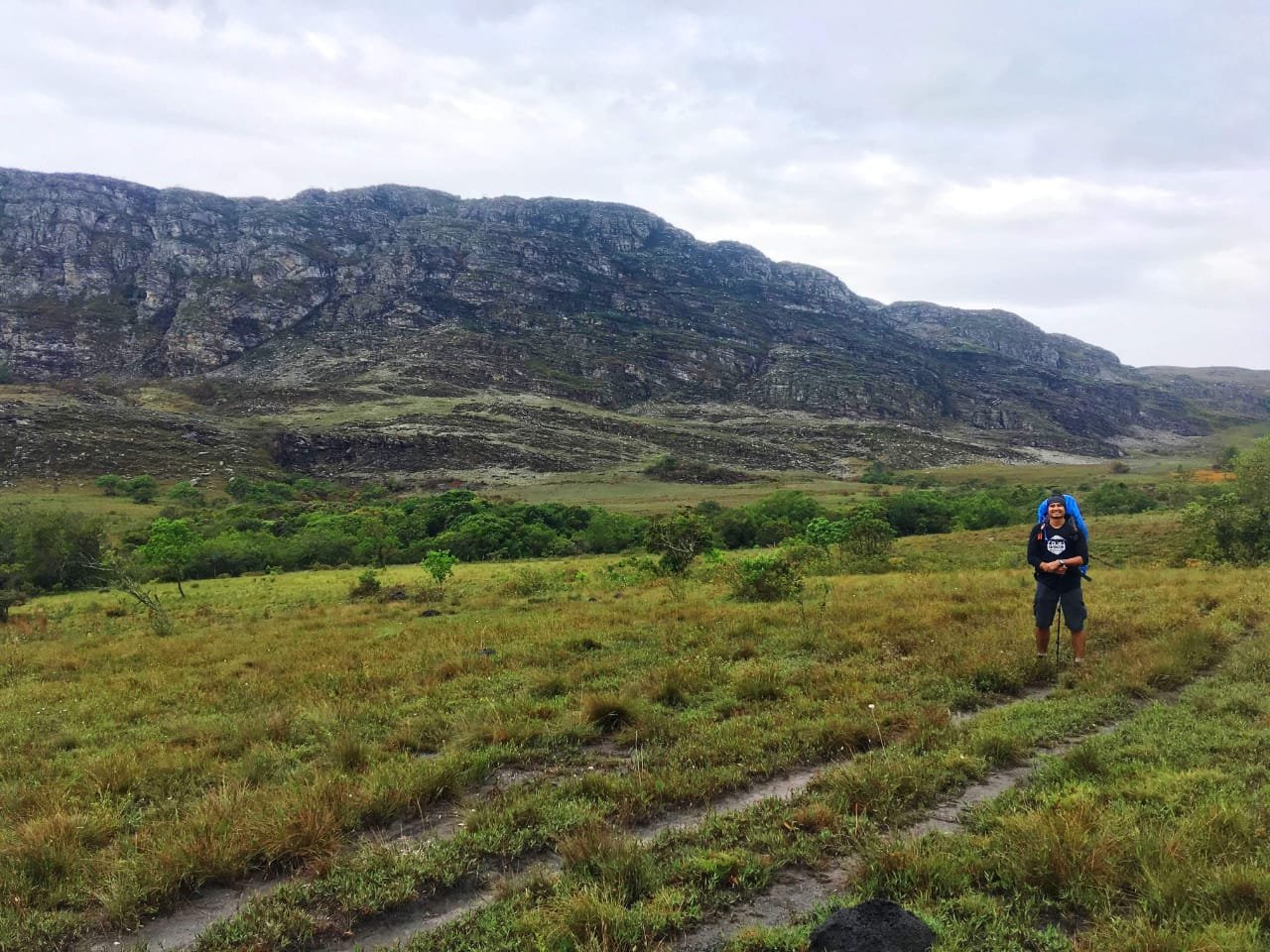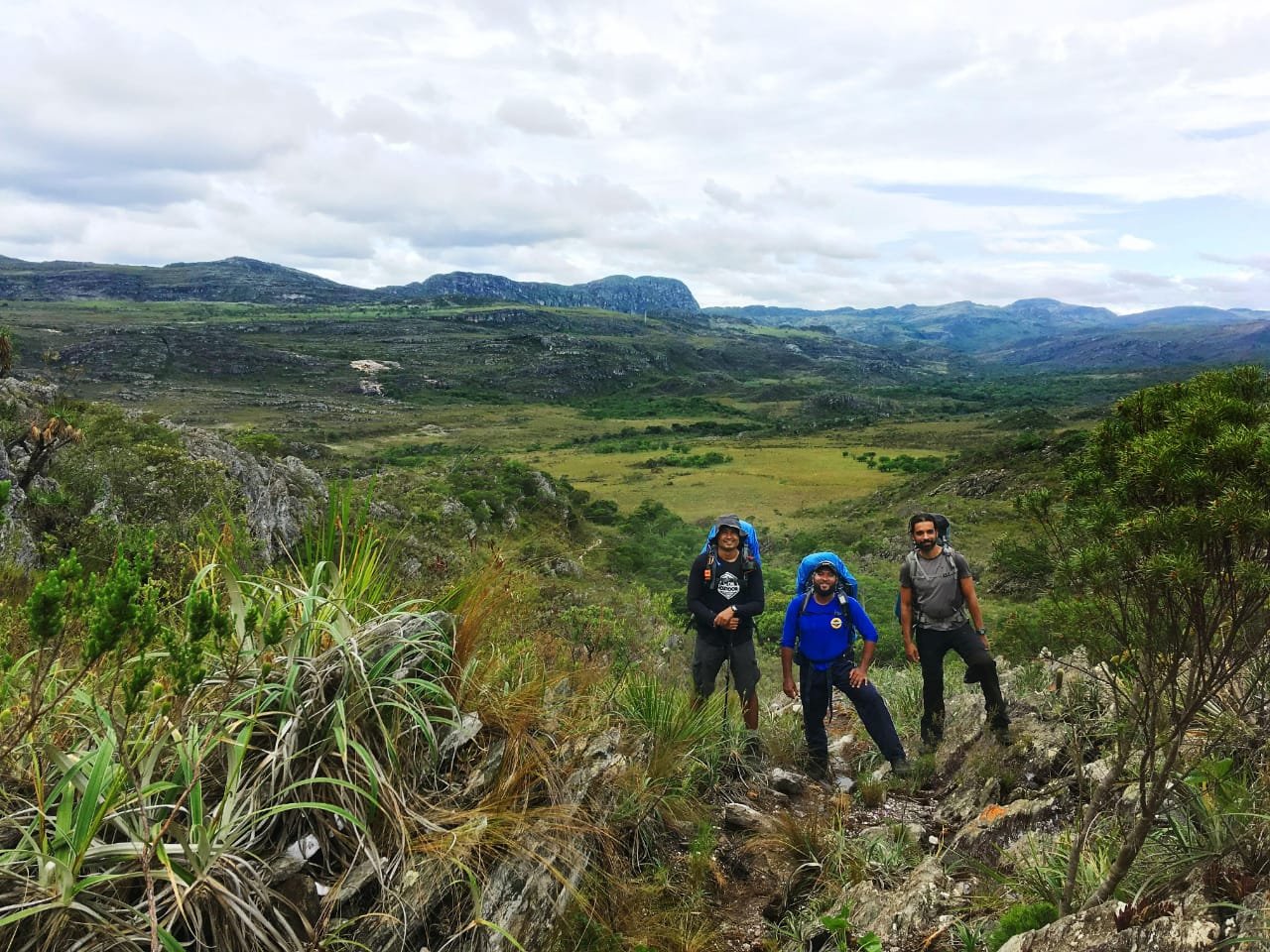 E não deu outra, após alguns minutos morro acima, depois de paisagens características, a chuva veio quando estávamos sob um relevo mais elevado da Serra do Espinhaço. Confesso que essa foi a hora em que pensei “Deu merda”, já que as previsões eram muito inseguras e que tínhamos pegado horas e horas de estrada com muita chuva. Mas não é que tudo virou em questão de minutos. Foi só começar a descer que a chuva parou, o tempo deu uma firmada, as nuvens permaneceram altas a caminhada se mostrou belíssima. Era de comum acordo entre todos o pensamento de que aquele tempo protegido do sol era ótimo e agradável para toda a travessia. Que continuasse assim.