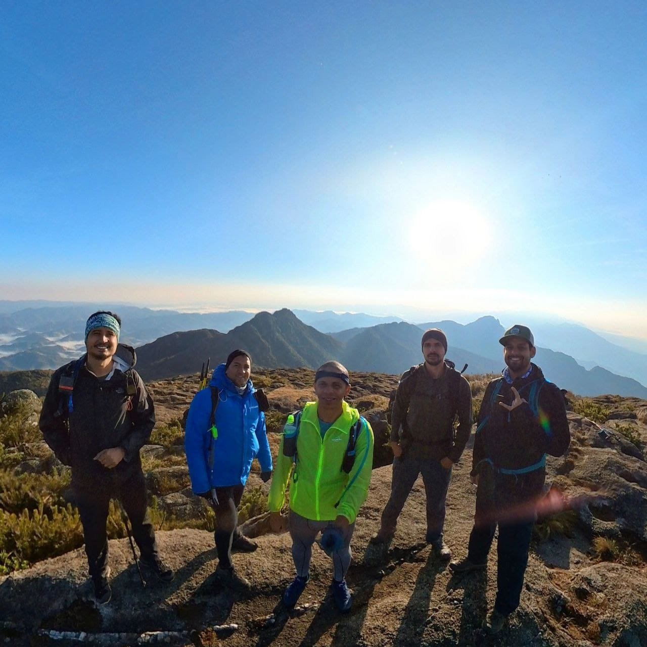Lá em cima não é que o sol demorou demais para nascer também... Quase congelamos real!! Ficou o aprendizado para o futuro. Às 6:35 o sol saiu e nos aqueceu por dentro, revivendo todos os amigos gelados... Logo os sorrisos e as brincadeiras voltaram. Nossa ideia era tentar atacar os cumes de Maria e Mariana, mas ao tentarmos procurar uma descida, não nos sentimos confiantes, desistindo desses ataques. Voltamos nossas energias somente para a travessia e, claro, curtimos o belo visual do cume.