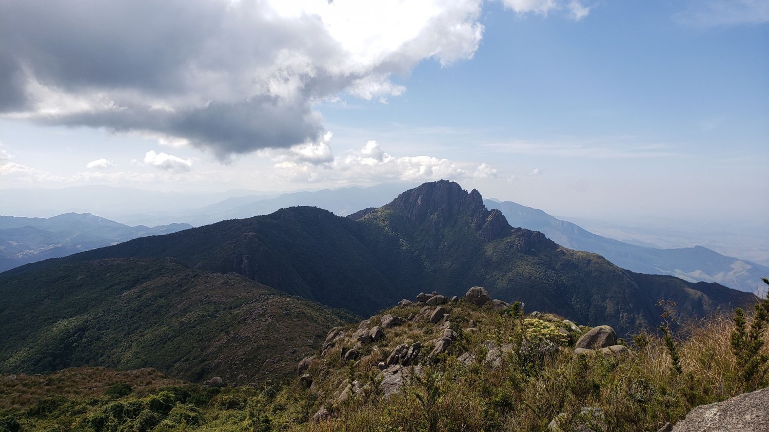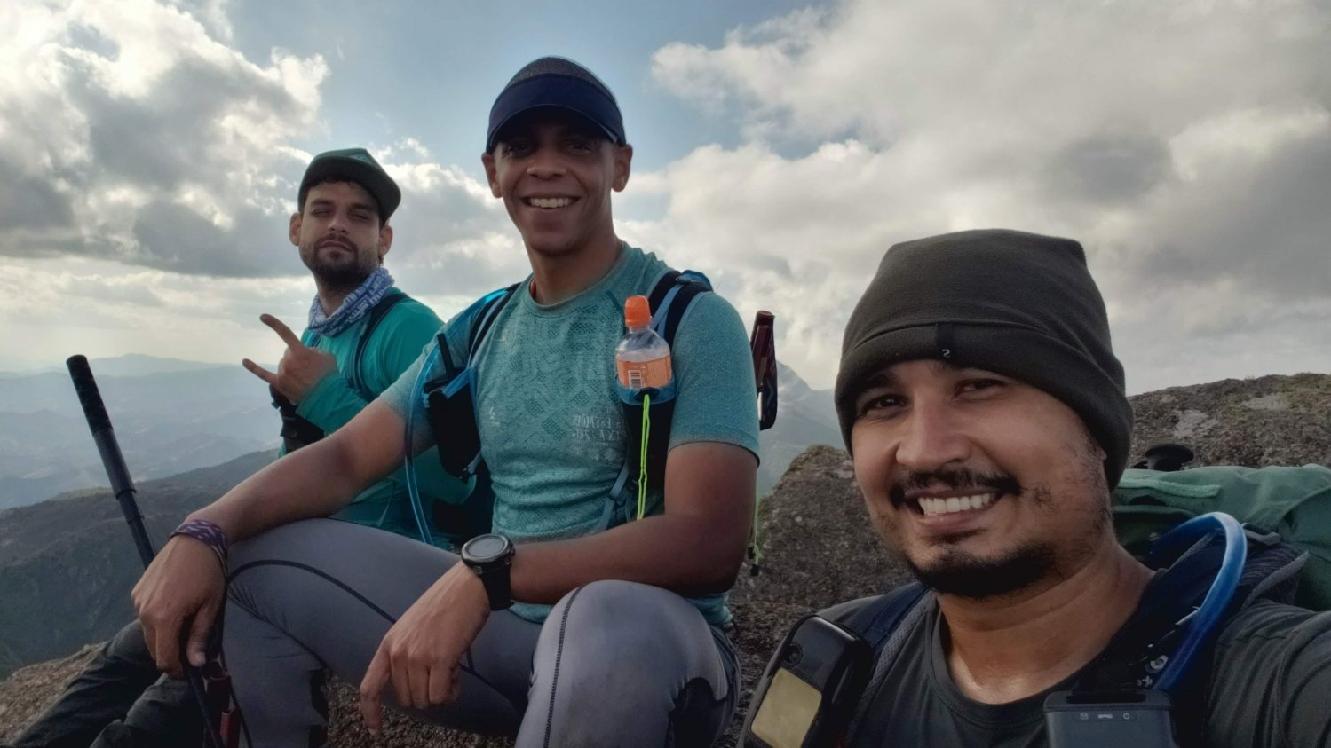 Alguns minutos de trilha, passamos pelo Morro do Careca e seguimos a subida, já chegando nos clássicos afloramentos rochosos. Daí pra frente o ritmo continuou forte entre rochas, matas rasteiras e capins mais altos. Certa hora, com o caminho não tão óbvio, olhamos para o GPS e confirmados o desvio à esquerda... Ah, também tivemos que pular ou escalaminhar alguns trechos fáceis.