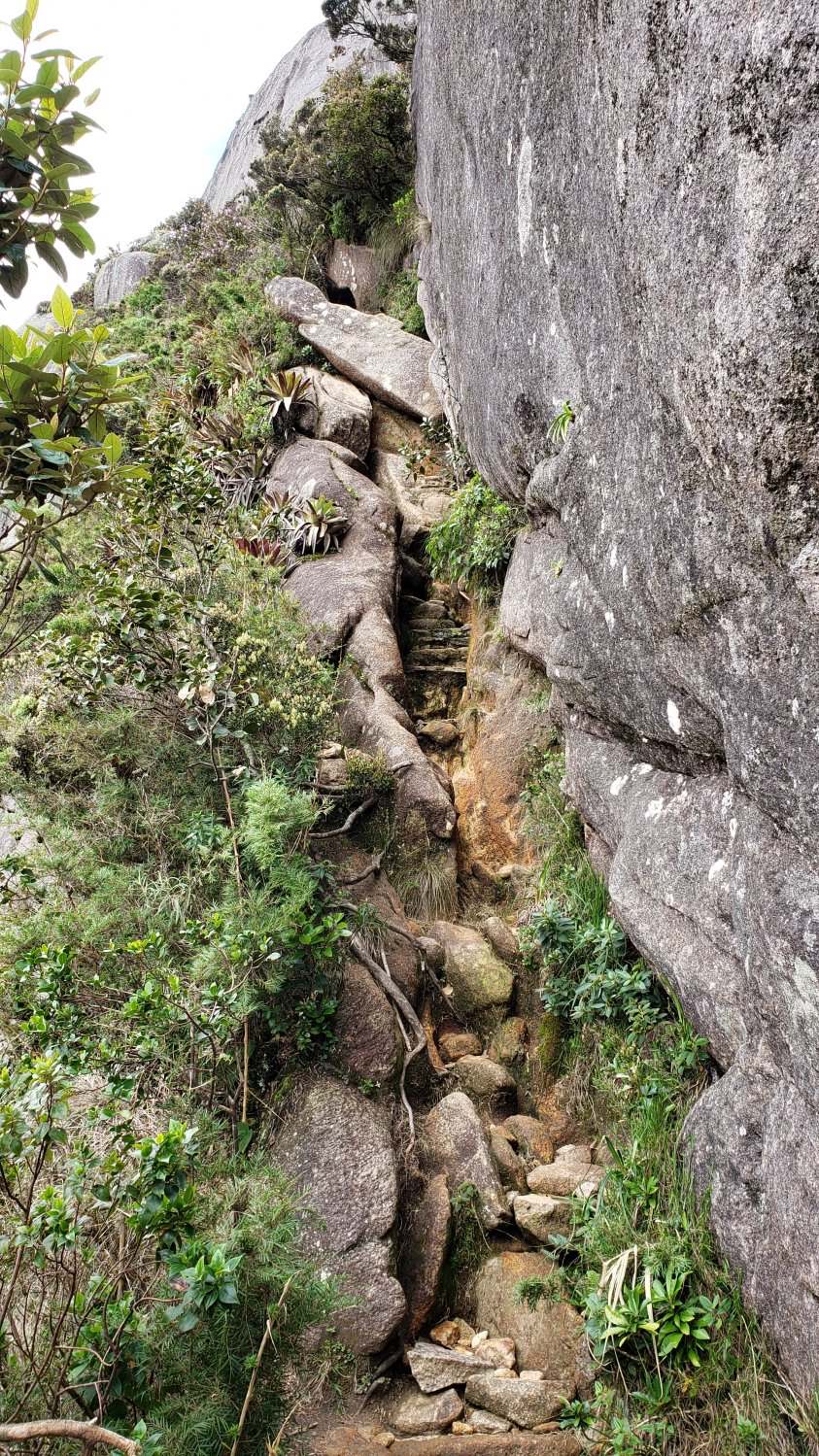 O trecho final se desenvolveu por aproximadamente 11km de uma suave descida, sempre seguindo o delineamento das curvas de nível. No início com um solo mais desenvolvido e repleto de raízes e rochas brutas, já no final, o que sobrou das trilhas coloniais feitas na época do império, com suas pedras “geometricamente” posicionadas que hoje se configura como um ponto de atenção pelas suas superfícies escorregadias. Vale ressaltar a parada na Cachoeira Véu da Noiva (também), mas agora a de Teresópolis.