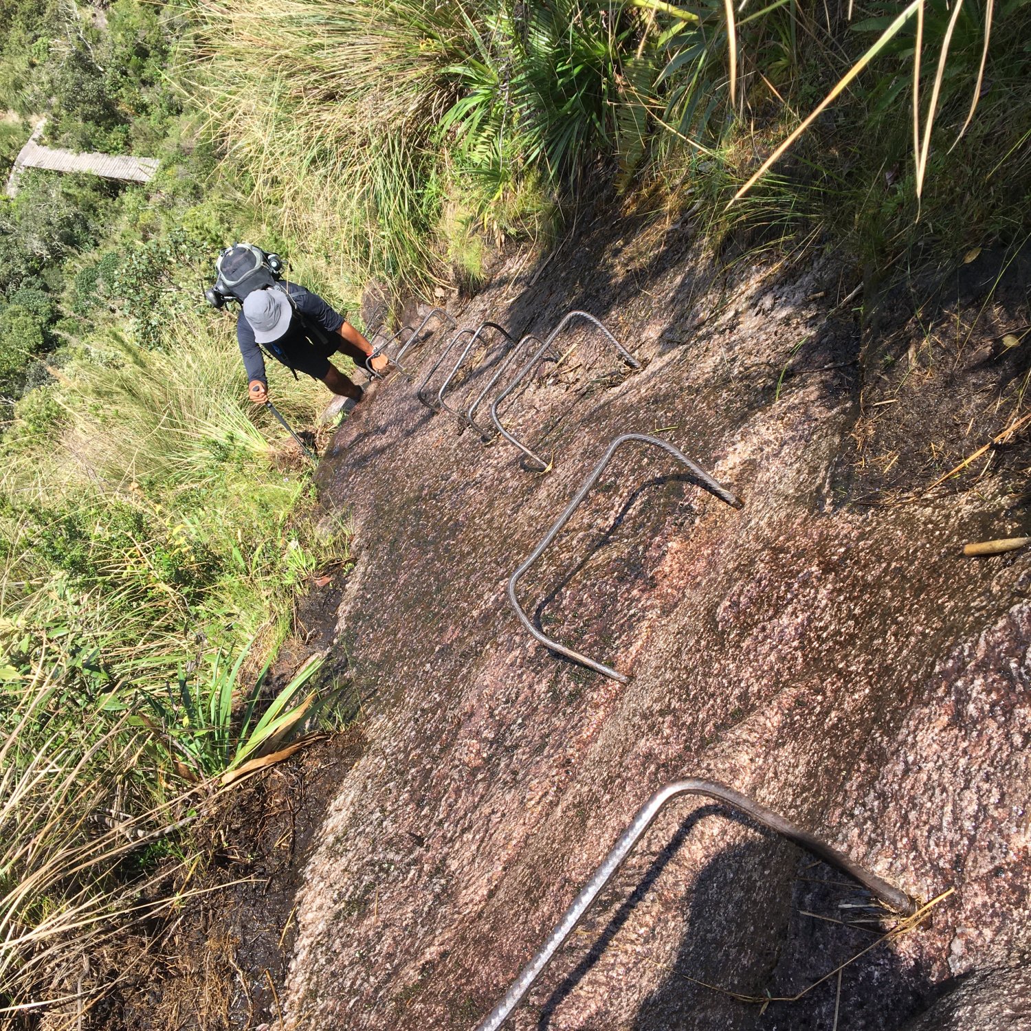 Subimos de volta ao ponto da bifurcação, encontramos as mochilas e voltamos à travessia. Descemos e subimos o segundo vale até o Morro da Luva. Continuamos adiante por uma das minhas partes favoritas da travessia: a descida/passagem pelo Morro do Balão até o pé do Elevador: uma escada de ferro íngreme e desafiadora para iniciantes. Para mim, que já estive tantas vezes lá, um dos pontos que mais gosto. Nos seus pés tem uma cachoeirinha. Paramos, nos abastecemos de água e fizemos um lanche reforçado por volta das 11:30. Subimos o elevador e chegamos ao alto depois do terceiro vale. Já não faltava muito para fecharmos o dia.