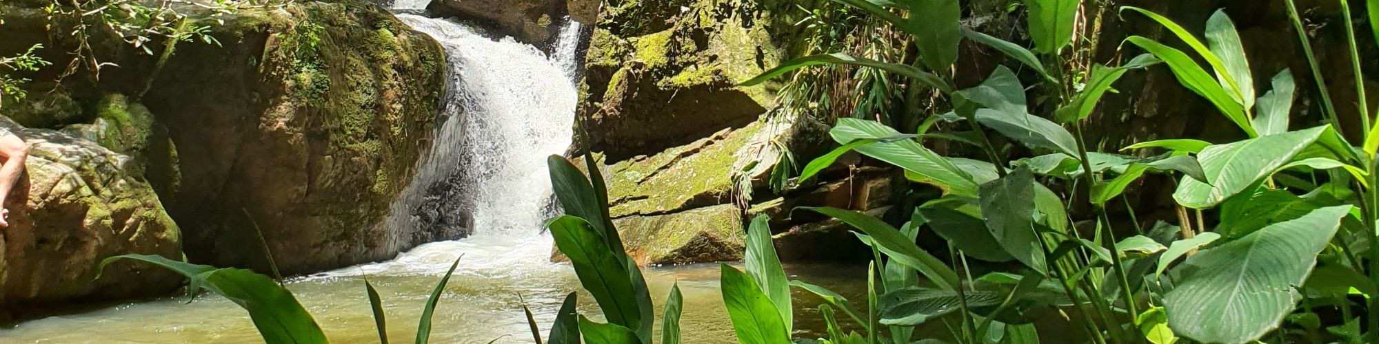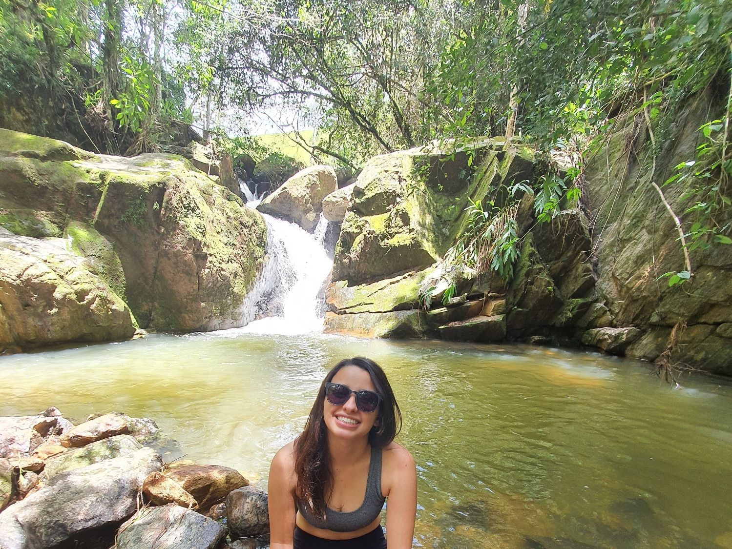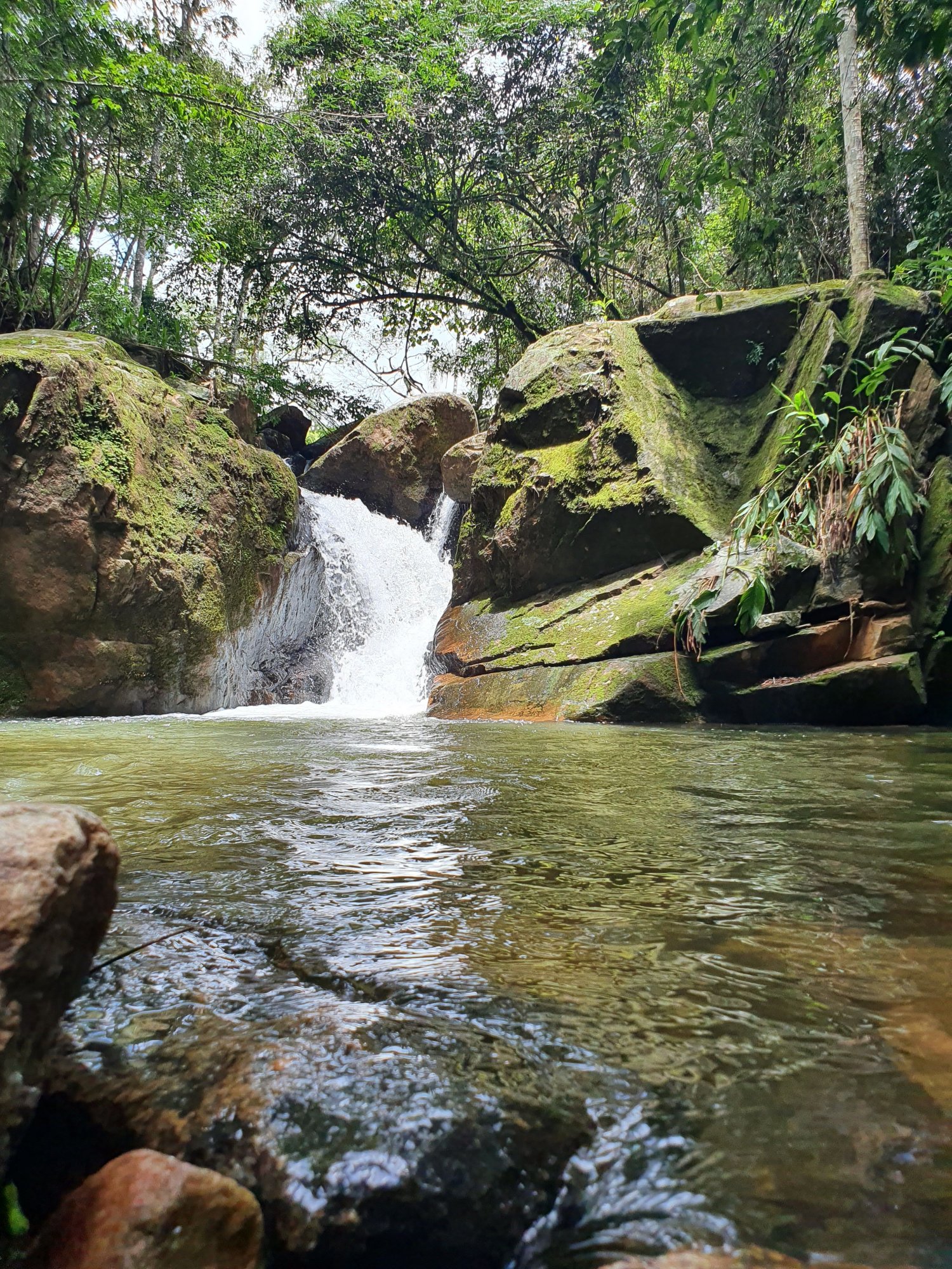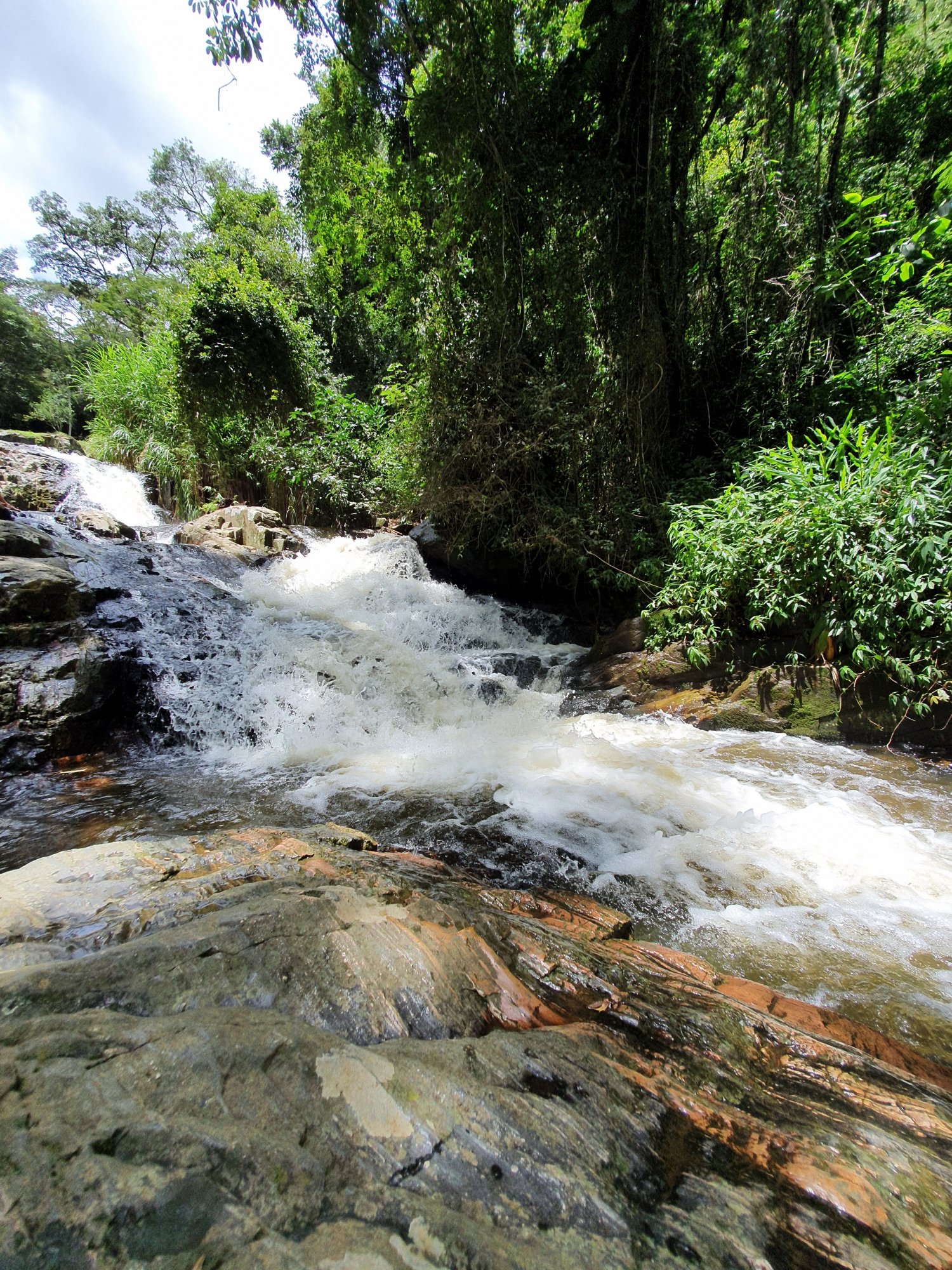 Não precisa fazer nenhuma trilha. É rodeado de verde, mas a mata é aberta. É um lugar gostoso pra ficar relaxando. Se você caminhar um pouco mais pra cima, tem mais quedas tipo essa da foto, e há também uma pequena garganta.