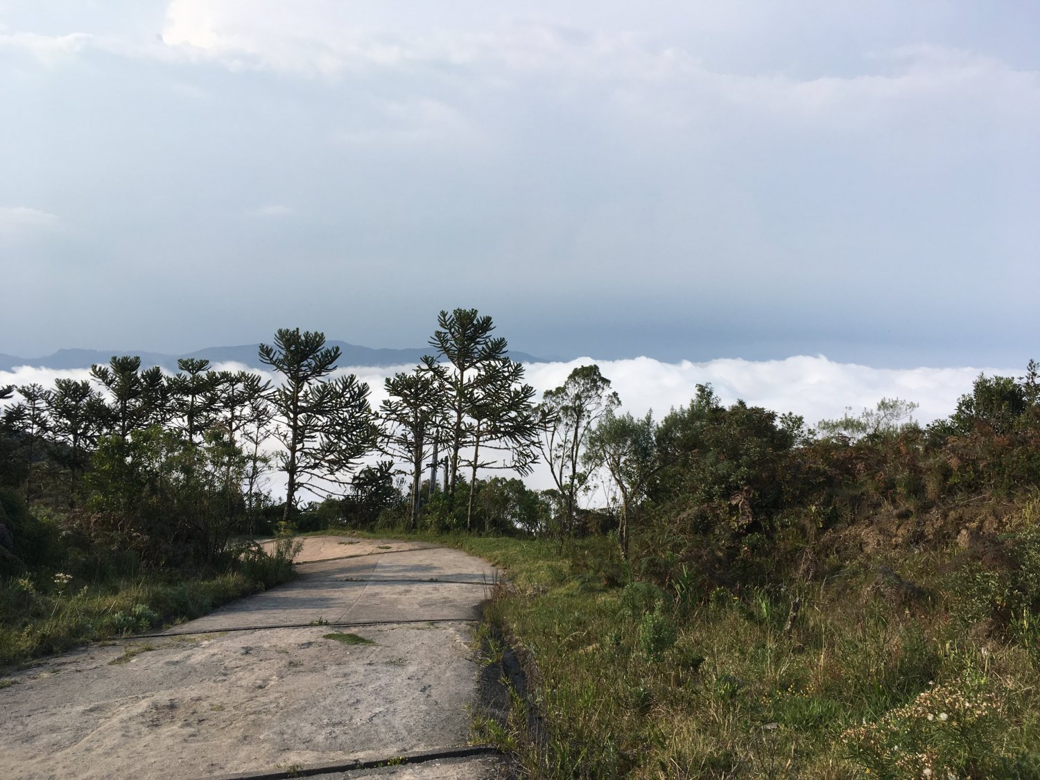 Começamos a subir e eu comecei a sentir um leve mal estar, um refluxo, e tenho quase certeza que foi por causa que eu almocei uma bela parmegiana e não descansei antes de começar a subir. E pra quem já foi sabe o quão íngreme é, fora meu despreparo fisíco com a mochila pesada. Fomos parando um pouco no caminho, Tamiris também não estava tão bem fisicamente. Entretanto, é uma trilha rápida. Levamos uma hora pra subir. A medida que íamos subindo as nuvens vinham atrás e já quase no pico dava pra avistar um mar de nuvens.