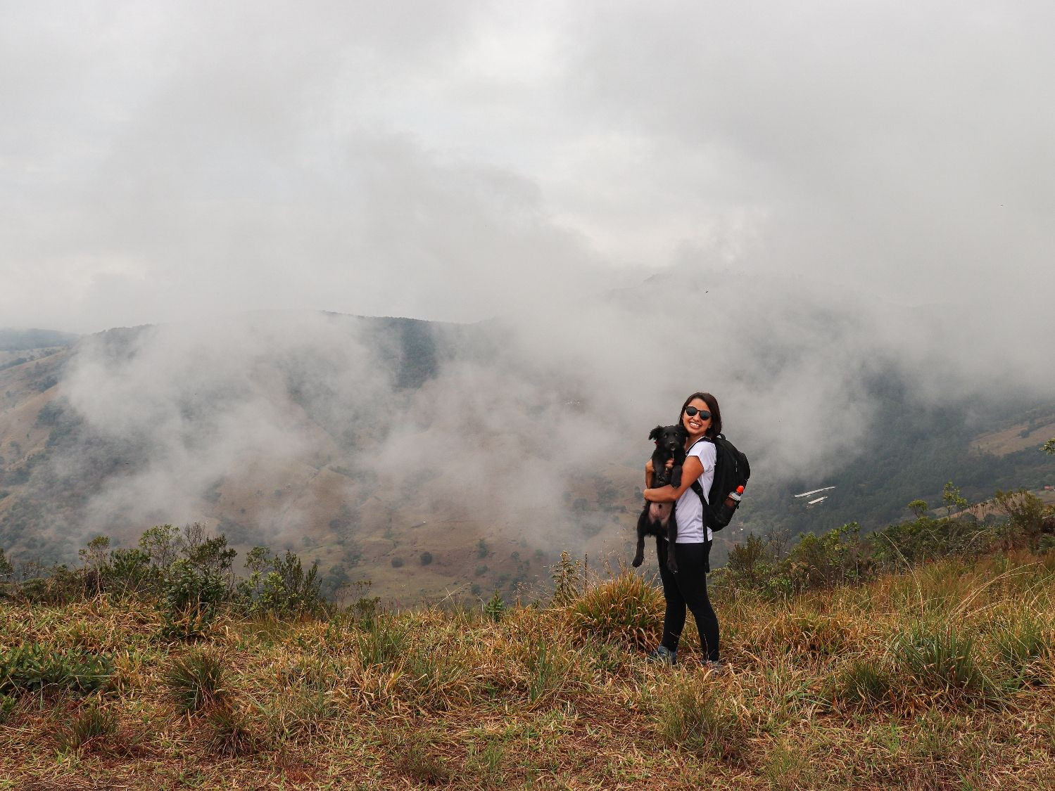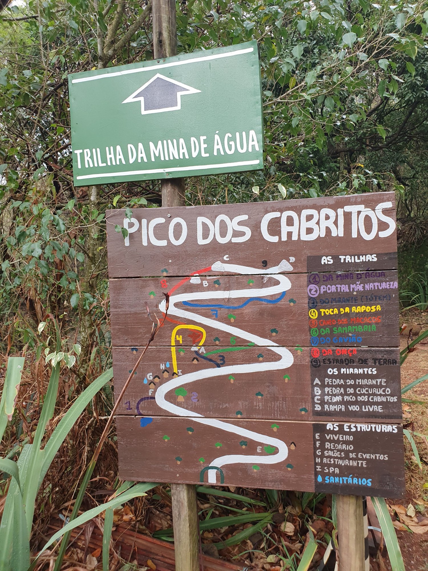 Orientadas, voltamos a subir. Há várias trilhas ao decorrer do caminho, mas optamos ir direto pela estrada mesmo. Nosso amiguinho, Nino, resolveu nos acãopanhar. Durante o caminho vimos as placas das trilhas, deve ser legal explorar todas elas, uma pedida para voltarmos. Levamos cerca de quarenta minutos para chegar no pico dos cabritos, a 1450m de altitude.