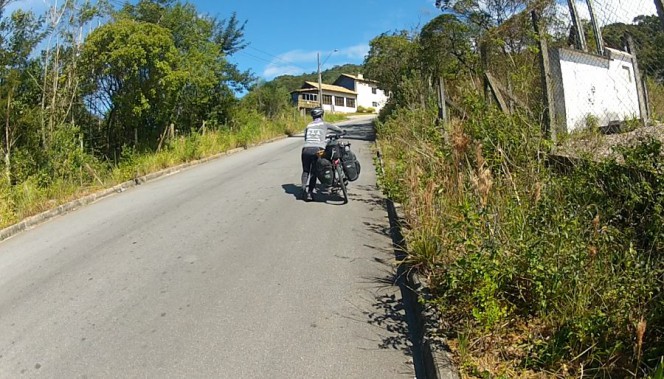 Ao chegar ao seu lado ele puxou papo e achou um absurdo... primeiro eu estar vindo de Curitiba de bicicleta, depois eu estar sozinha e mais ainda eu estar pedalando por aquela estrada e não pelo asfalto. Se apresentou e disse que iria me acompanhar, porque ali era muito perigoso. Seu nome era o Vilson, peixeiro da região da Pinheira, que foi me escoltando e jogando conversa fora pela janela até eu chegar novamente no asfalto. Mais um anjo da guarda enviado!