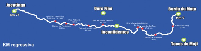 O caminho tem um total de 71 Km, saindo de Jacutinga, passando pela zona rural de Ouro Fino, Inconfidentes, zona rural de Tocos do Moji e finalizando na Basílica do Carmo em Borda da Mata.