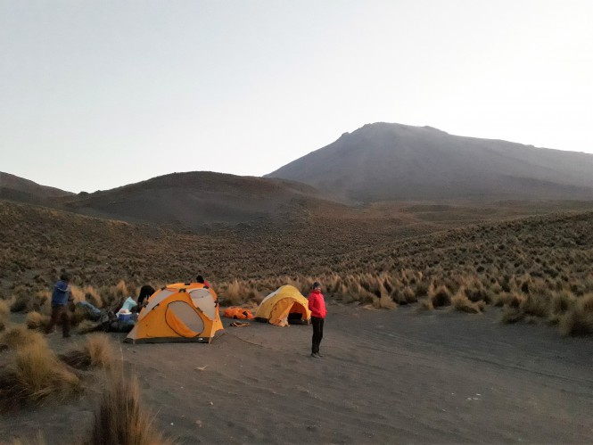 O campo base tem uma boa estrutura de dome onde descansamos depois de cerca de 3 horas de subida. Já com o dia amanhecendo, reiniciamos a jornada agora em um terreno mais arenoso que reduzia a velocidade de subida e exigia bastante da musculatura.