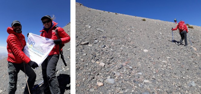 Embora próximo ao cume, o caminho ainda era bem íngreme e levaria ainda mais de uma hora para alcançá-lo. Apesar de todo o desgaste das já 9 horas de subida, os efeitos da altitude e emocionalmente abalada, com o pensamento focado nele e o apoio e a motivação do guia e agora já amigo Alain, a vista deslumbrante, de onde podia se ver todo caminho e esforço percorrido, a Andréa conseguiu uma energia extra que fez com que fosse possível chegar ao desejado Cume de 5.825msn.