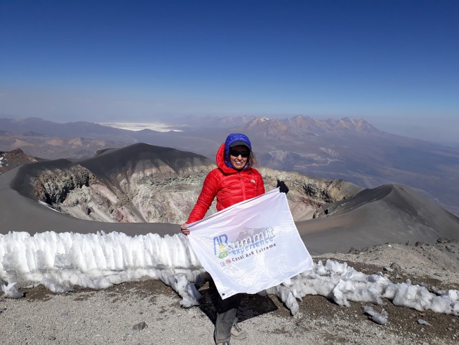 Ainda com os olhos cheios de lagrimas, a Andréa ficou fortemente emocionada ao ver o incrível lugar que estava, de um lado a frente do vulcão Chachani, do outro a cidade inteira de Arequipa com a cruz que sempre simboliza o Cume e a fantástica cratera, que depois na cidade ficamos sabendo que alguns dias atrás estava dando sinais de atividade. A emoção de estar lá carregando a bandeira “Casal A+R Extreme” fez a Andréa recarregar a energia, lembrando que a chegada ao cume é só uma parte do caminho e ainda teria pela frente toda a descida até o acampamento.