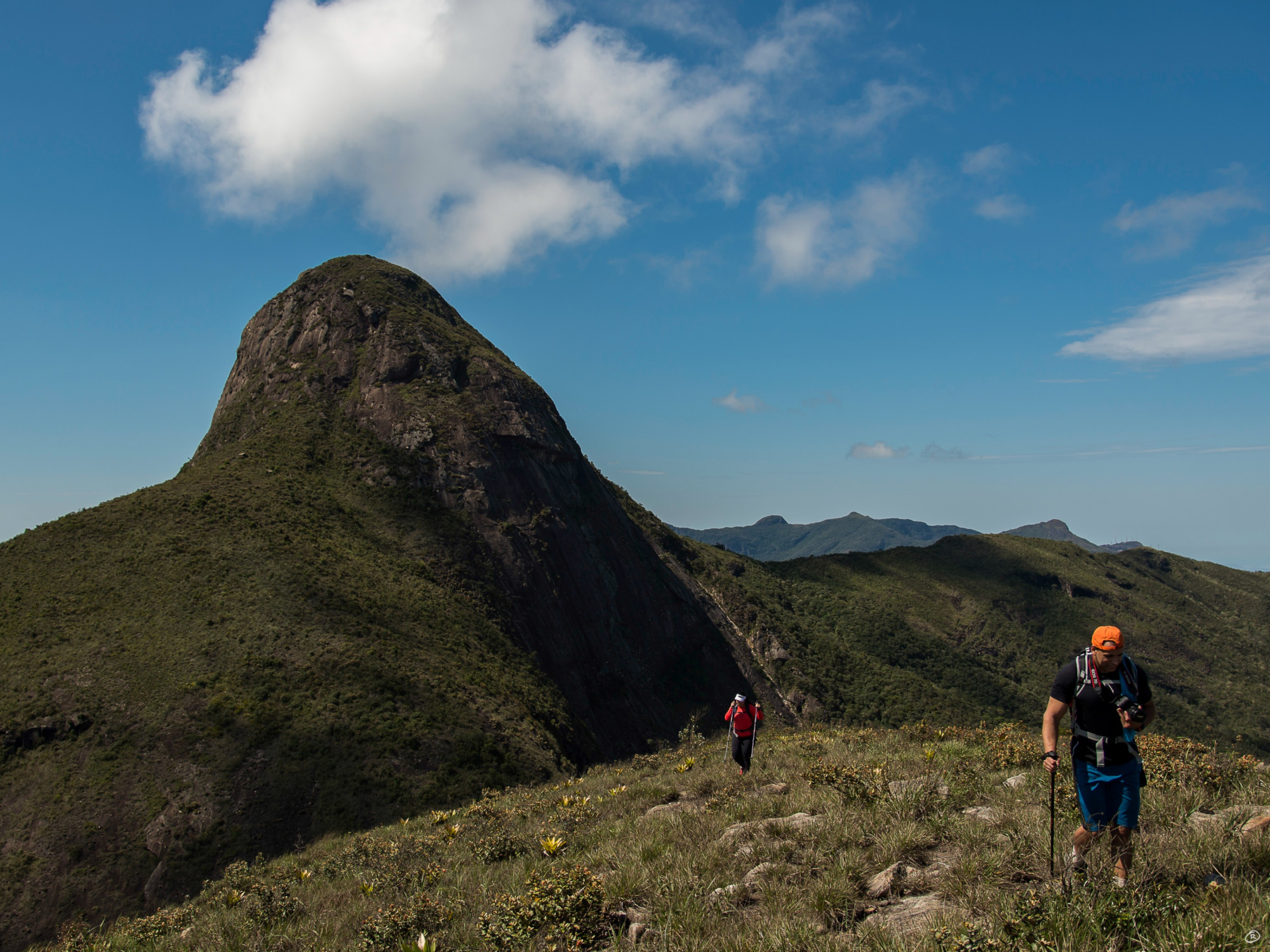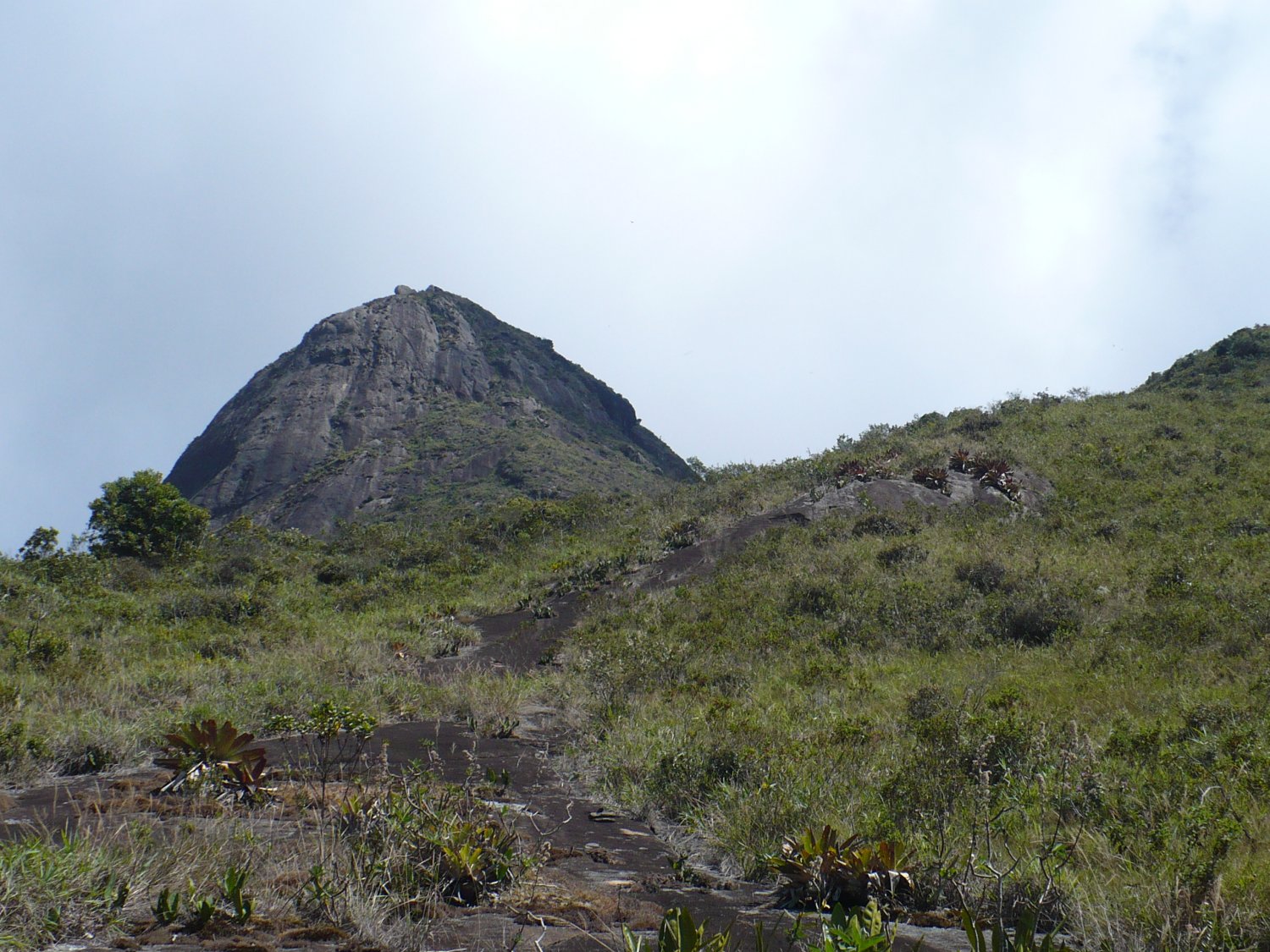 Em um determinado ponto, quase paralelo a essa crista, a trilha começa a descer. Cuidado nessa descida, pois o capim esconde algumas armadilhas do caminho. No final da descida, a trilha entra na mata até a base da pedra, onde começa a subir suas encostas em um trecho mais íngreme. Quando chegar na crista, marque também esse ponto para facilitar o seu retorno. Uma vez na crista, é só tocar em frente até o cume da montanha. A trilha ainda passa por um pequeno trecho dentro da floresta que é muito bonito. O trecho final é feito com vegetação bem rasteira.