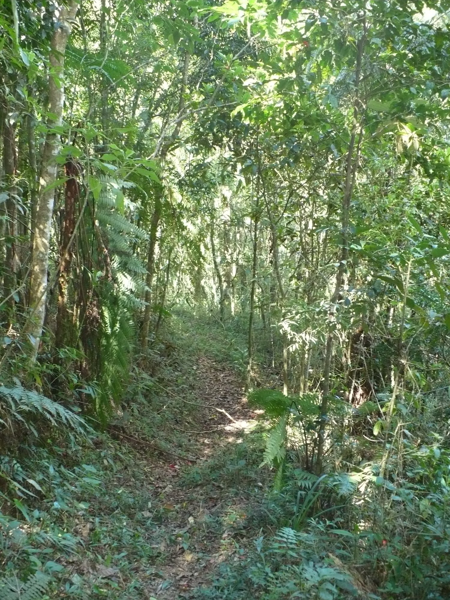 A trilha começa à direita nos fundos dessa casa, e logo entra na mata. Na primeira bifurcação devemos pegar a esquerda e continuar subindo em um trecho de zigue-zague, com a trilha bem marcada. Depois de um bom trecho dentro da mata, chegamos a uma laje de pedra com um riacho. Nesse ponto é preciso ter muito cuidado, pois a trilha exige que você desça alguns metros por essa laje para retomá-la na outra margem. A laje é BASTANTE escorregadia.