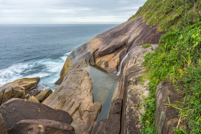 Acordamos cedo e seguimos para a trilha que exige um pouco de preparo e tem trechos confusos. Tem uma subida inicial um pouco mais exigente e depois alterna subidas e descidas mais leves. Já tínhamos tentado chegar até a Cachoeira alguns anos antes, mas erramos a trilha naquela época e paramos em uma casa abandonada. Não conseguimos encontrar a trilha certa e tínhamos pouco tempo no dia, então voltamos. Dessa vez tínhamos GPS com o trajeto e não teve erro. Não sei que caminho pegamos na época, mas não passamos de novo por essa casa. Chegamos no Saco Bravo em 1h40min. Tem um trecho um pouco complicado nas pedras para chegar no poço, mas tinha duas cordas fixas que ajudam a descer. Não demos muita sorte com o tempo. Assim que chegamos na cachoeira começou a chover um pouquinho, mas o lugar é incrível e vale a pena ser visitado de qualquer jeito. Logo depois de nós, chegaram quatro caras que vieram correndo de Laranjeiras. Ficamos pouco tempo por causa da chuva e voltamos em um ritmo um pouco mais lento. Dormimos mais um dia em Ponta Negra para pegar a trilha mais pesada no dia seguinte. Chegou muita gente nesse dia para pernoitar no camping. Talvez umas 15 pessoas. Ficamos um tempão na fila para tomar banho.