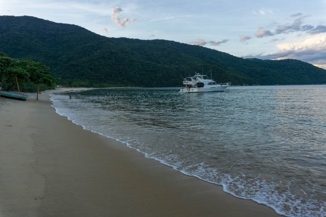 Fomos acordados pela Lalá, cachorrinha da Dona Dica. Ela subiu sozinha de manhã, depois soubemos que ficou assustada com o vento. Foi engraçado pois estávamos brincando com ela quando o Charlico tropeçou no chinelo e ela saiu correndo chorando. Ele nem encostou nela, coitada. Procuramos em toda parte e Lalá não estava mais lá. Pensamos e confirmamos depois que ela tinha descido para ficar com a Dona Dica na praia. Nos despedimos dessa família maravilhosa que sempre encontramos com muita alegria e partimos para o Saco do Mamanguá.