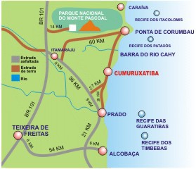 A vila fica na divisa sul com o Parque Nacional do Descobrimento e o Parque Nacional do Monte Pascoal, primeira porção de terra avistada por Cabral em 1500 e o último reduto de mata atlântica no extremo sul da Bahia. Despois do Parque, ao norte, está Trancoso e Porto Seguro.