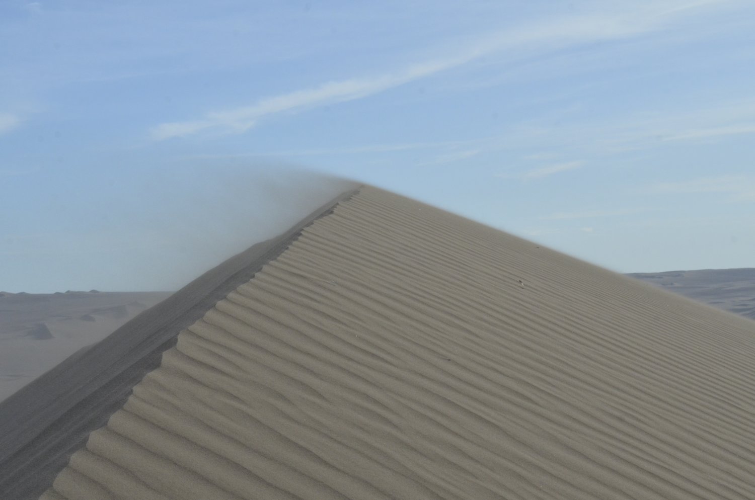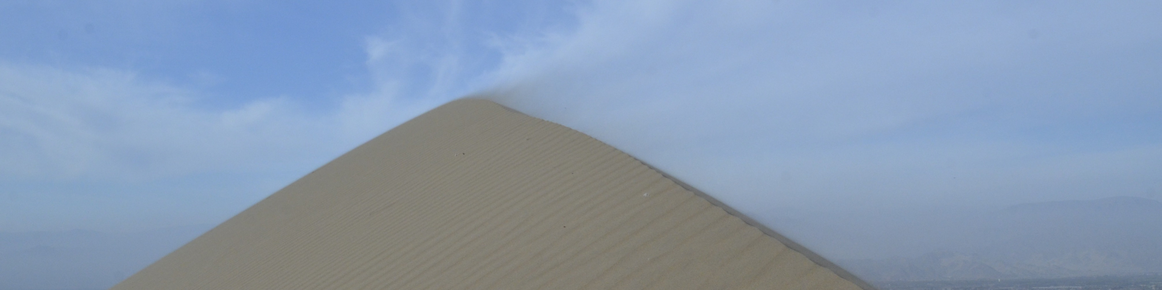 Na borda superior da duna, o vento se intensificava e a areia se desprendia da duna voando e caindo como uma cascata.