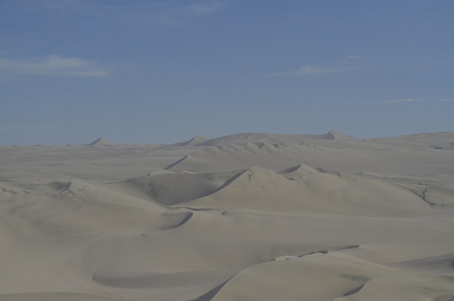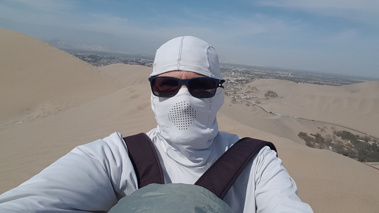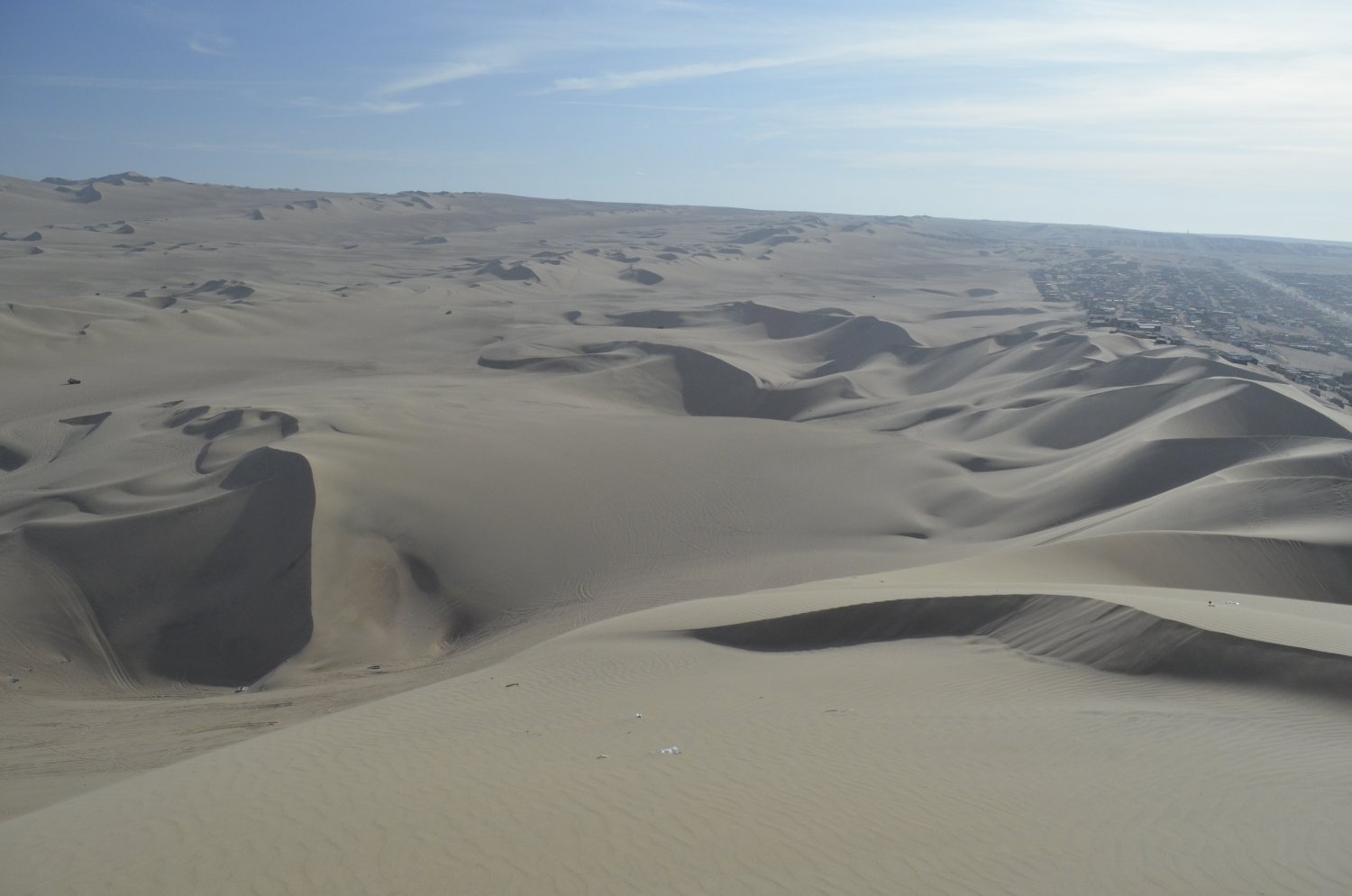 Ao vencer o paredão de areia, a visão do horizonte foi fantástica. De um lado o deserto que se estendia a perder de vista, com dunas tão piramidais que pareciam estruturas feitas pelo homem, e do outro lado, a cidade de Ica, seus bairros afastados e o início da Cordilheira dos Andes, com suas montanhas áridas.