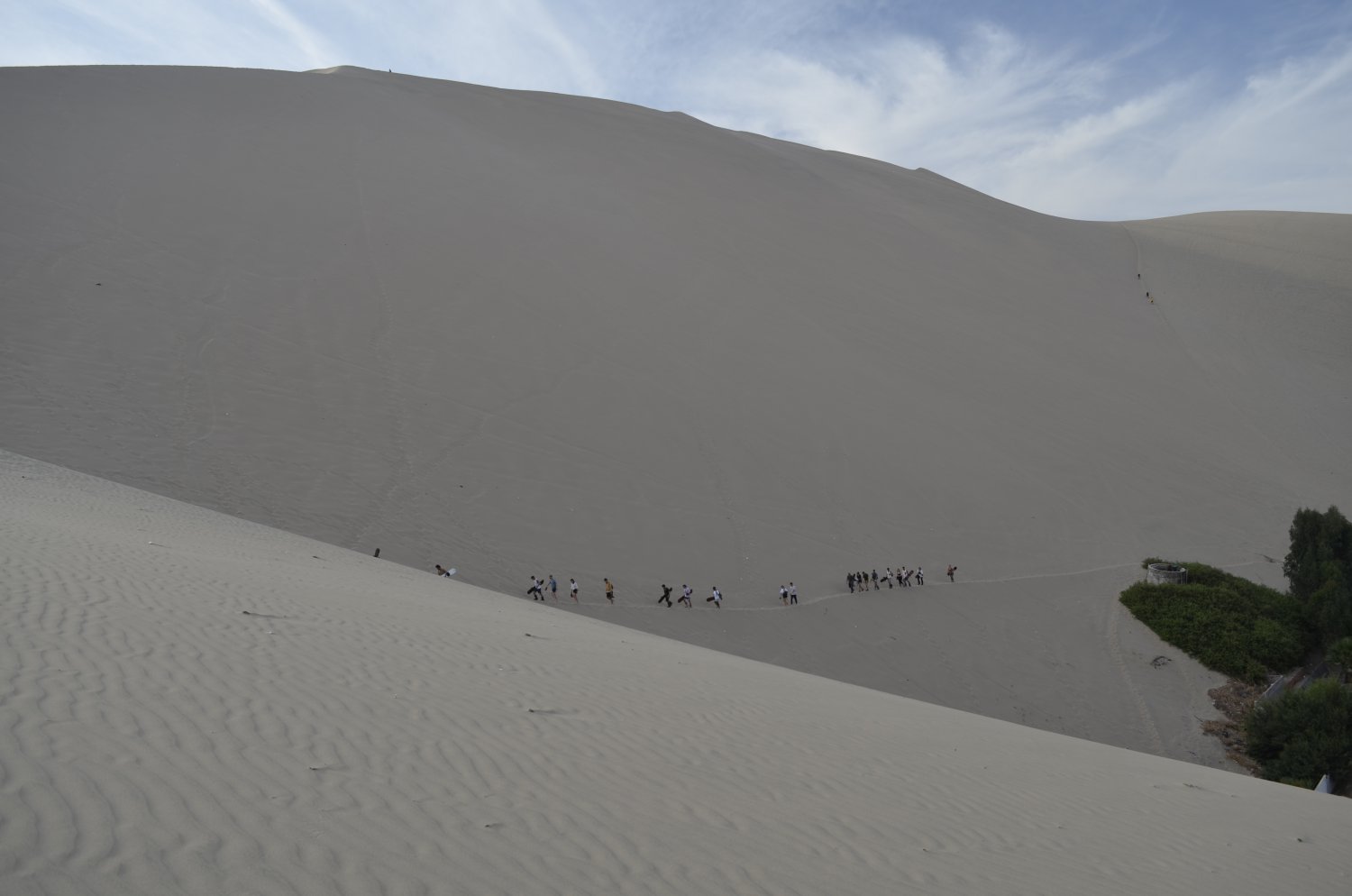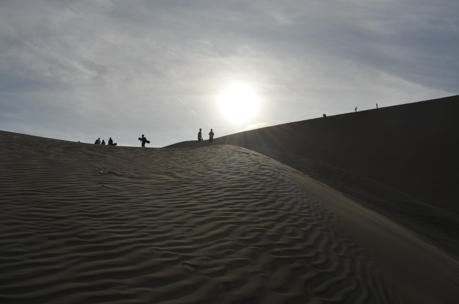 Desci então por uma outra vertente e cruzei com um grupo grande que estava subindo a duna para praticar o sandboard.