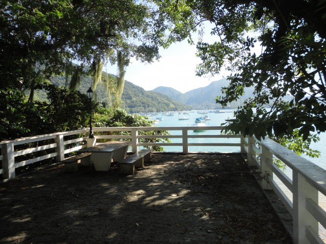 Após caminhar um pouco em aclive por uma rua de terra (onde ainda é possível chegar de carro ou moto), há uma garagem náutica particular que reservou a laje de cima como um mirante (creio que público) muito charmoso, com vista para o Saco da Ribeira.