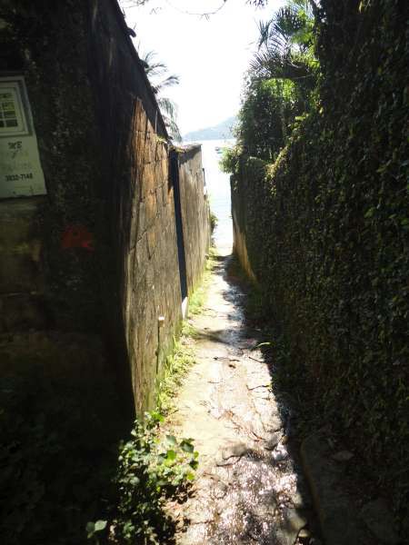 Ao final da rua, há uma estreita passagem entre muros residenciais, que dá acesso à Praia da Ribeira