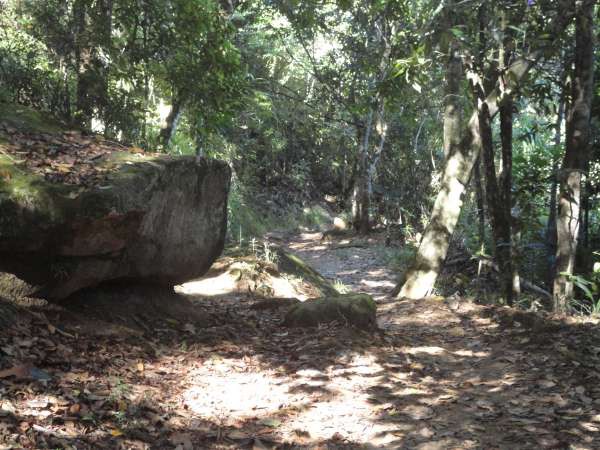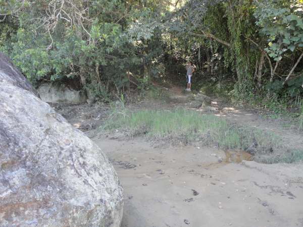 No final da praia, junta a uma imensa rocha, começa a trilha. No início a vegetação é formada por pinus e eucaliptos e aos poucos a vegetação nativa vai se revelando mais exuberante.
