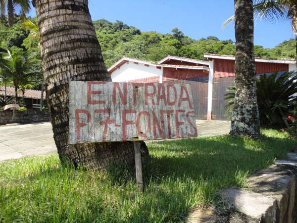 Seguimos até o fim da praia esperando encontrar o reinício da trilha para a Praia das 7 Fontes mas só encontramos placas com os dizeres "propriedade particular, não entre e cão bravo". Na verdade, o acesso à trilha está no meio da praia, em uma viela entre muros.