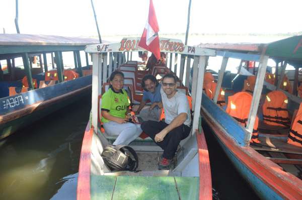 Na manha do dia combinado, fomos de motocar até o Porto Callao no município de Yarinacocha, às margens do lago e tomamos o barco pilotado por nosso guia Ronald Sandro Taboada Quispe.