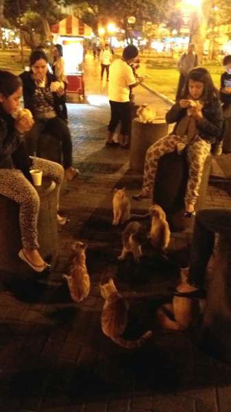 Como nosso voo chegou por volta do meio dia, tivemos tempo de conhecer o bairro no entorno do Hotel, que fica numa das principais avenidas de Miraflores, a Av. Jose A. Larco. A poucas quadras dali, nos deparamos com uma praça de gatos. Mas são muitos gatos. Trata-se da Praça Kennedy.