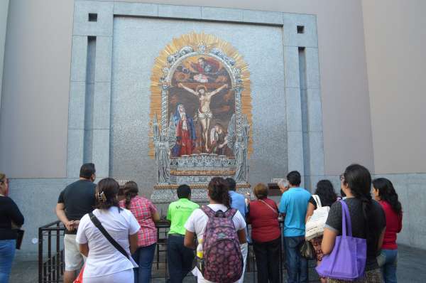 Uma réplica do afresco fica exposta no lado externo, onde devotos fazem suas preces.