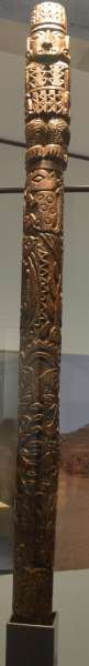 Imagem do Deus Pachacámac. Neste totem estão representados os 3 níveis da existência: o inferior (dos mortos), no meio, o mundo dos vivos e na parte superior a espiritualidade, trilogia que também está na cultura Inca, representados pela serpente, puma e côndor.