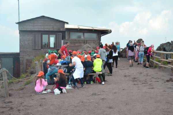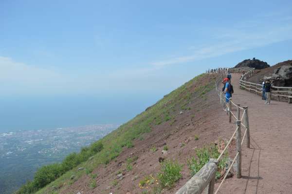 Havia pessoas de todas as idades, o que demonstra que a trilha é fácil e vale muito a pena, tanto pela visão da cratera do vulcão e suas fumarolas (sim ele está ativo), como da vista de toda a baía de Nápoles.