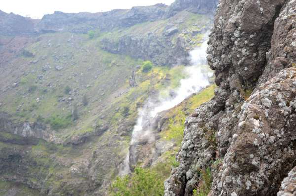 Vista parcial da imensa cratera, com fumarolas ativas