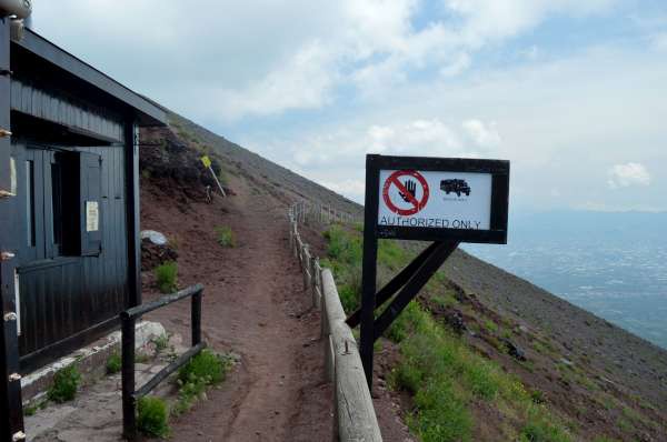 O ‘estacionamento’ fica a mais ou menos a 1000 metros de altitude e há local para compra de ingresso (mesmo preço da agência próxima da estação de trem de Ercolano).