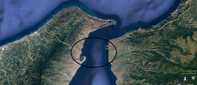 A passagem do continente para a Ilha da Sicília é feita pelo estreito de Messina, onde o canal tem apenas três quilômetros de largura.