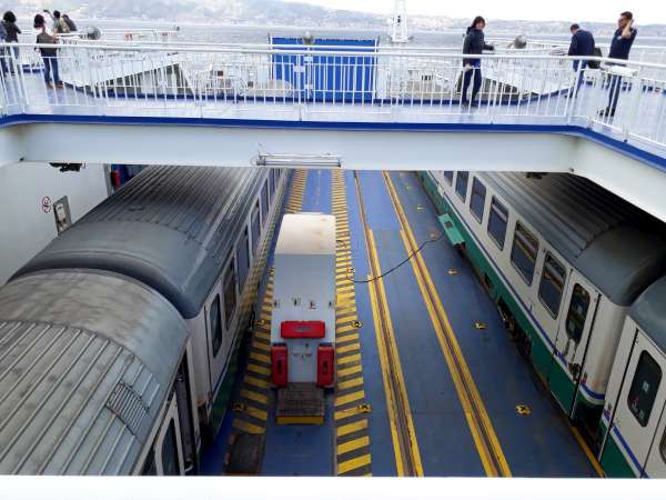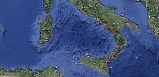 A viagem de trem de Salerno a Catânia (20 Euros), levou cerca de 7 horas, considerando que duas horas foram gastas na travessia.