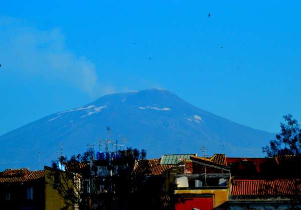 Visão do Etna desde a cidade de Catania, com um resto de neve no cume e uma grande fumarola. Os pontinhos pretos no ceu azul são centenas de andorinhas que dominam essas bandas na primavera