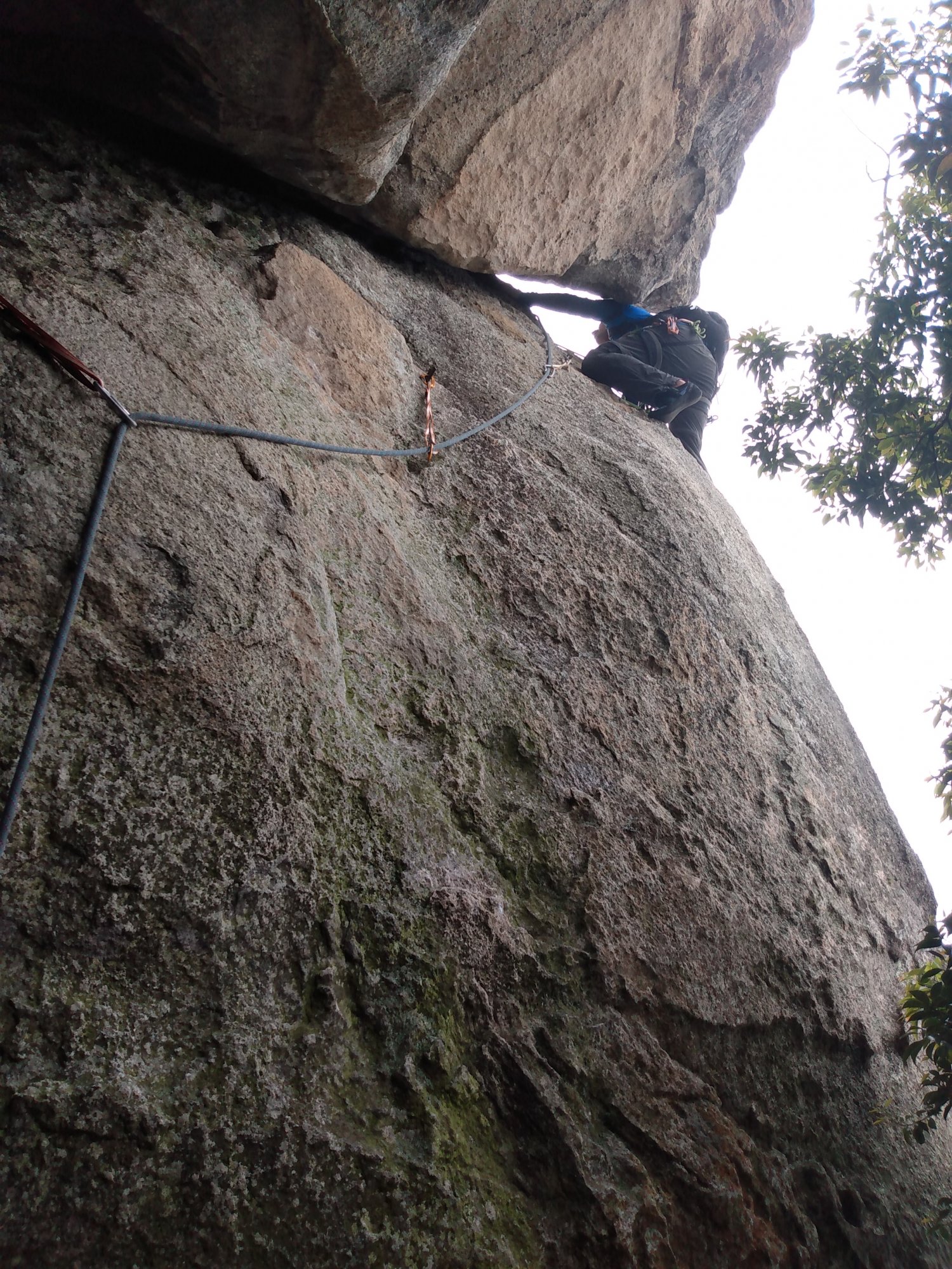Depois seguimos por mais duas horas e meia de mais cabos e trepa-pedras até o começo da escalada: a passagem da Maria cebola, onde existe uma saída de 5º grau, depois contorna num trecho muito exposto, para mim, um dos mais adrenados da via, que não são poucos. Muitos lances com a faca nos dentes…