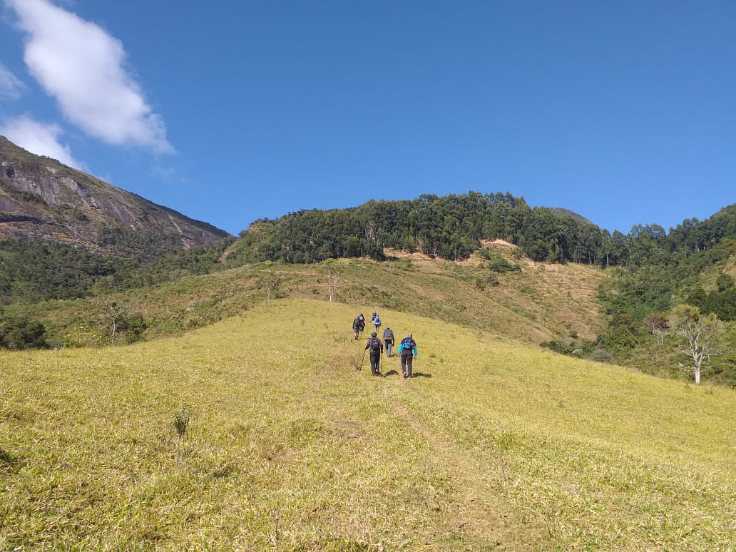 As 9h10 começamos a trilha entrando por um caminho ao lado da fazenda. A caminhada passa por um pasto de onde já se pode contemplar um vista linda das montanhas ao redor, além de algumas vaquinhas e bois. Ao subir um pouco, a trilha se espalha em caminhos de bois e, por um descuido, pegamos um deles. parte do grupo voltou para retornar a trilha original e outra parte seguiu por outros caminhos de bois até retornar a trilha que estava logo acima, como podíamos ver pelo gps.