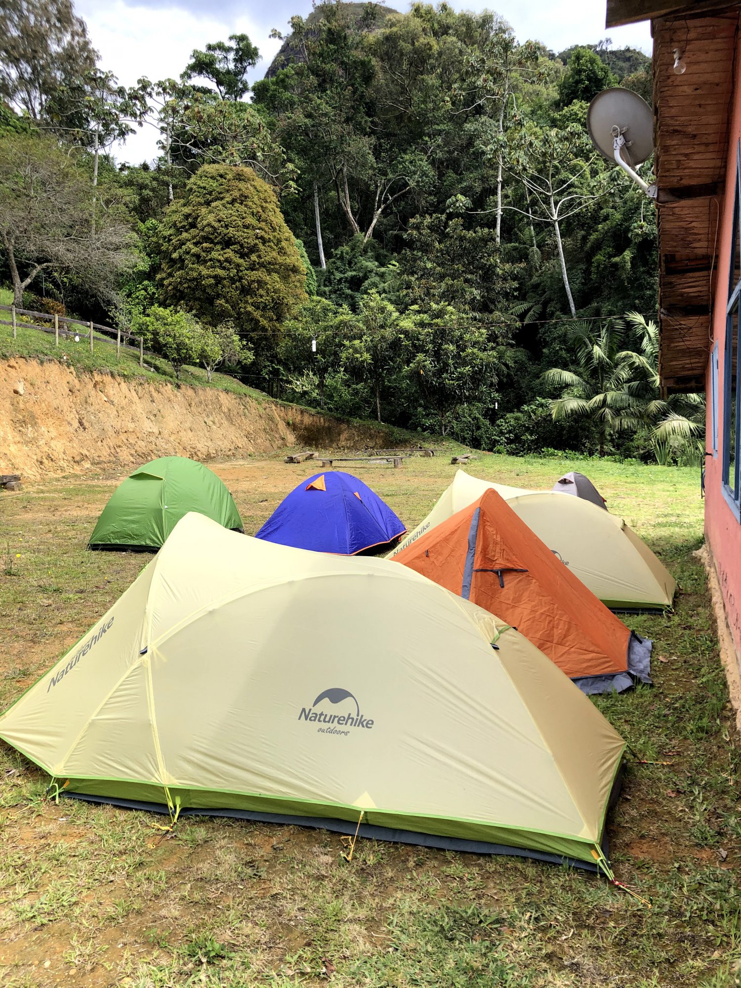 Já na pousada às 6:30, montamos barracas e tomamos café (20,00) na espera do grupo de amigos chegarem. Por volta das 7:30 lá estavam eles com as risadas e brincadeiras típicas. Eles também montaram seus equipamentos, tomaram café da manhã com muita descontração e se arrumaram para a trilha do dia. O destino escolhido foi o cume do Cabeça de Dragão e, caso possível, a Caixa de Fósforo.