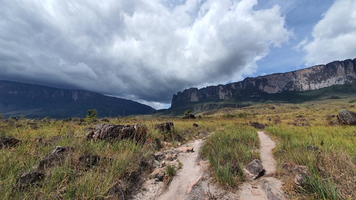 A caminhada toda decorreu em um terreno sem muitas variações altimétricas atenuadas. A paisagem era linda logo de cara, com os gigantes Tepuis do Monte Roraima e kukenán no horizonte o tempo todo. Foi quando eles começaram a demonstrar a sua força. No meio da caminhada a chuva nos acertou. Felizmente, não foi forte o suficiente para causar algum estrago.