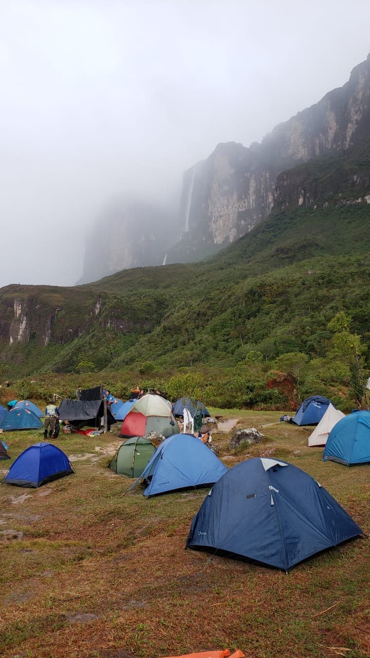 Enquanto tomávamos nosso café da manhã, com gostosas arepas venezuelanas, era possível avistar o que nos esperava – havia chegado o dia de tentar atingir o topo da montanha. Olhando a partir do acampamento, o caminho não é óbvio, pois o colosso de pedra se exibe totalmente vertical e não parece oferecer uma rota de trekking. Apesar disso, nosso guia Leopoldo explica que a caminhada acontece pelas escarpas do paredão, com trilha bem marcada.