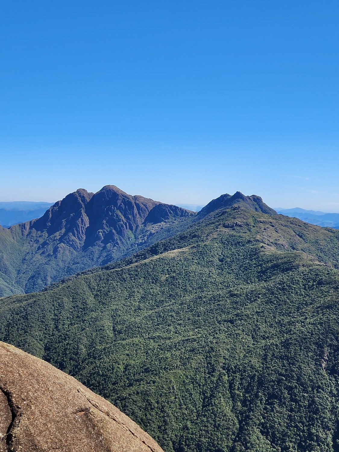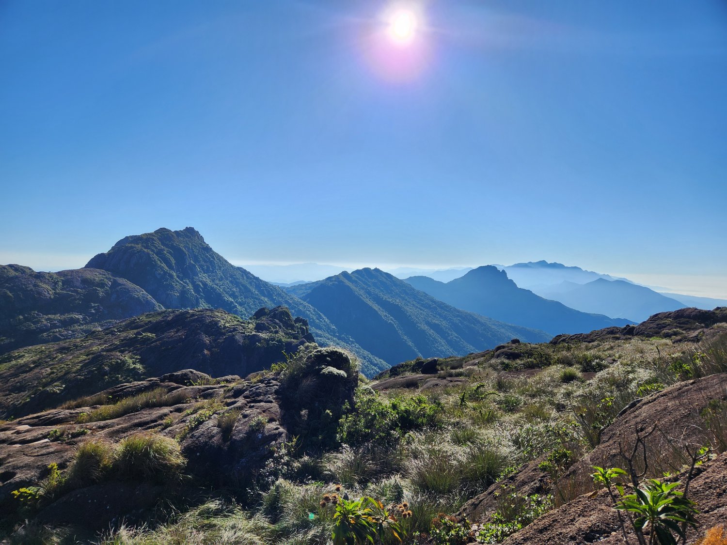 Paramos, reforçamos o café da manhã, guardamos as mochilas em um local onde a vegetação as escondia com certa eficiência e subimos leves e animados o primeiro cume do dia. Apesar da leve confusão para achar o melhor caminho no início, logo encontramos o trajeto de totens bem definidos, marcados por subidas íngremes e, por horas, meio lisas. Aos poucos fomos progredindo animados, enquanto o sol se mostrava mais quente e o vento mais forte. Muitas foram as paradas para contemplar e tirar fotos da paisagem que surgia à esquerda de nosso caminho. Dali vimos não só todo o trajeto que percorreríamos como também a bela continuação das cristas da Serra Mantiqueira fortemente marcada pela Serra Fina ao fundo de um imenso céu azul.
