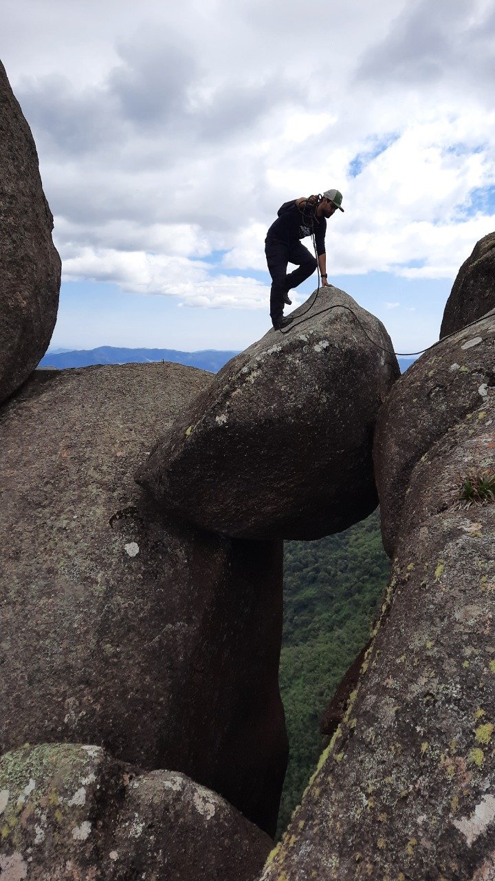 Varando as lajes de pedra, escalaminhando aqui, pulando ali, em cerca de 20 minutos chegamos lá em cima… enquanto uns paravam para tirar fotos, Negreiros foi adiantando a colocação da corda no Pulo do Gato, Nó de um lado, pulo e nó do outro… essa corda foi fundamental, já que ela deu confiança a todos passarem… geral PULOU. Tiramos a corda e fomos desviando pela esquerda, logo depois da silhueta do gato. Chegamos ao cume, mas queríamos ir no ponto alto do livro. Demos a volta na pedra encaixada, subimos de chaminé e pulamos… do outro lado, jogamos a corda para que todos também fossem. Aos poucos, estávamos todos no cume do Itaguaré.