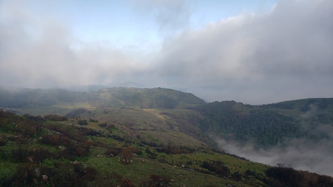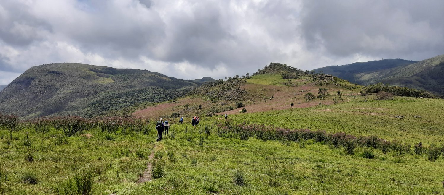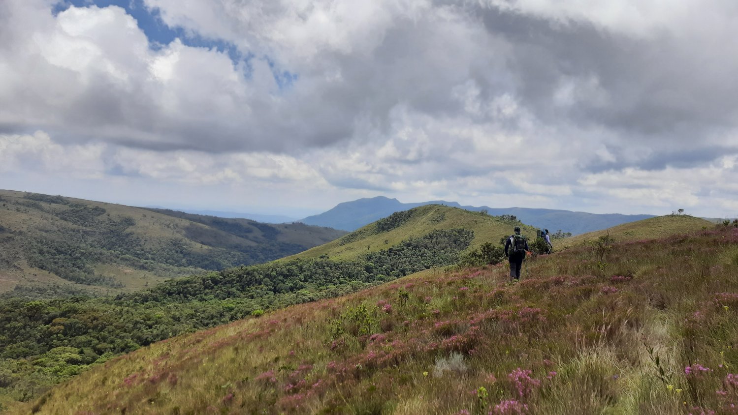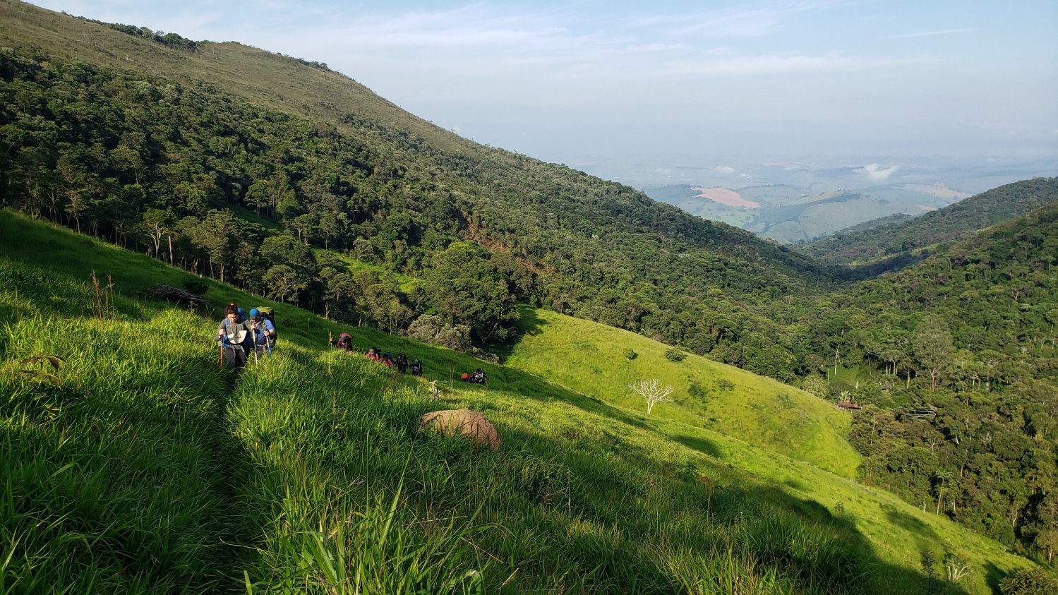 Lá em cima, paramos para respirar um pouco e continuamos em uma crista de morro também com declive. Seguimos sempre pela margem esquerda, mais descampada e com trilha paralela ao topo. Em algumas vezes, a mata surgia, mas cabia transpor ela ou dar a volta mais pela esquerda ainda para continuar. A aparência parecia de uma caminhada mais tranquila do que os subidões que já tínhamos enfrentados, mas era só a aparência mesmo. No fim, essa caminhada pela crista rendeu bons aproximados 3km chegando até 1.880m de altitude. Aqui a noite mal dormida na van e o peso nas costas começou a castigar. Começamos a perceber uma queda de rendimento e o cansaço expresso no rosto de todos. A pergunta mais frequente dizia respeito a quanto já tínhamos caminhado e quanto ainda faltava para fechar o dia. Doía o coração ter que responder: “falta muito”. E faltava mesmo, ao todo, caminhamos ⅓ do que estava programado. Só nos restava levantar a moral de todos, também a cabeça e seguir.