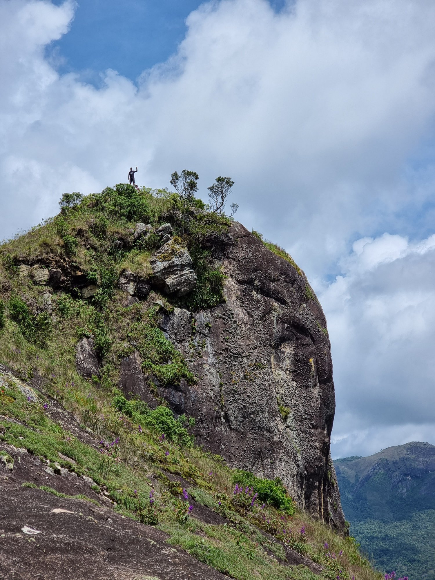 Antes, cruzamos o Cume do Pico do Tamanduá, seguimos adiante tangenciando o morro próximo pela sua esquerda. Encontramos o ponto de camping antes do Pico do Papagaio e seguimos pela mata. Logo em seguida passamos por um outro bom ponto de camping na base do pico. Entre clareiras de capim alto e florestas mais fechadas, chegamos à subida mais íngreme do cume. Pulando pedras e com cuidadosas aderências, fomos progredindo até que, por volta de 12:00, chegamos ao cume do Pico do Papagaio… Muita felicidade no ar… Nosso objetivo sonhado dos últimos 5 dias foi atingido, revelando um belo visual de quase tudo que tínhamos caminhado e de toda a região do entorno. A placa indicava a altitude de 2.100m, mas o sentimento de satisfação era imensurável. Depois de quase 2 anos sem a realização de eventos por conta da pandemia, lá estávamos nós novamente, organizando um evento de grande complexidade e (quase) concluido com muita disposição. Não tem como explicar em palavras o que é a felicidade de vencer um grande desafio e, em simultâneo, poder promover os mesmos sentimentos para pessoas tão boas… é algo diferente e único.