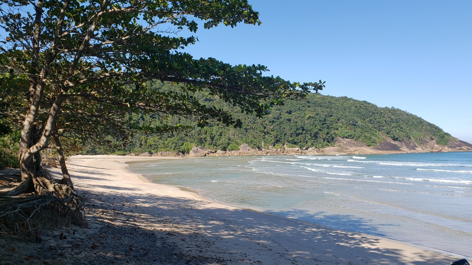 Finalmente descansados, colocamos as mochilas nas costas e começamos o que, para todos, foi o pior trecho da travessia toda, foram cerca de 3,5km com ganho de 400m, ao final. Descemos e chegamos na praia grande todos felizes em finalmente sair daquela área de mata praticamente sem vista alguma e conseguir admirar mais uma linda praia em que o nome inclusive já diz tudo, ela realmente é bem grande. Por conta do horário, mais ou menos 17h, decidimos tentar fechar algum camping por lá mesmo, falamos com o sobrinho da Dona Jandira, único camping da Praia Grande, que é o mesmo do bar que fica no fim da praia e nos dirigimos até lá.