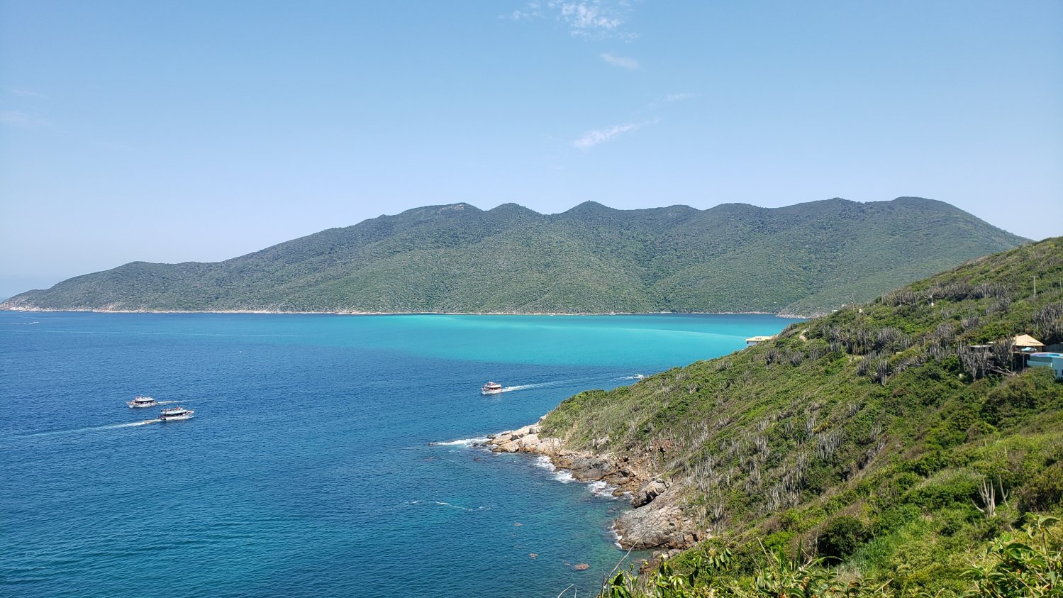 O grupo andava bem. Algumas pessoas mais rápidas, outras mais lentas, mas como um todo, em um bom ritmo. Ao fim da Prainha, tomamos à esquerda por dentro do restaurante, avançamos um pouco pela trilha margeando o morro, paralelo ao mar, até chegar na Praia da Graçainha, muito usada por pescadores locais. Depois de uma boa explanação do Dino, tocamos para cima em trilha erodida, virando a direita em um antigo caminho abandonado, à esquerda novamente cortando as curvas de nível, depois para a direita dando a volta por trás, chegando ao ponto mais alto do morro. Ali, tomamos à direita até chegarmos no Mirante da Praia do Forno, um dos pontos mais bonitos do dia.. Dali, víamos as belas águas transparentes da Praia do Forno, bem como a Ilha do Farol e o belo contraste do mar de águas escuras e claras de Arraial do Cabo. Valeu a parada para muitas fotos.