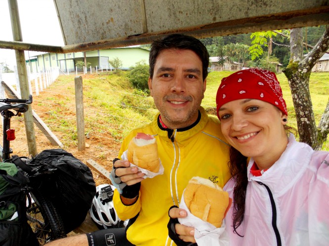 Logo após a subida sempre vem uma bela descida e aí nos largamos. Nem o vento gelado e a chuva nos impediram. Encontramos uma parada de ônibus e foi ali mesmo que fizemos o nosso almoço. Não foi fácil comer sanduíche vendo a fumaça e sentindo o cheirinho de churrasco nas casas, afinal era domingo...dia de churrasco. Ficamos ali por um tempo e o frio aumentou. Foi quando começamos a pensar na ducha quente do hotel.