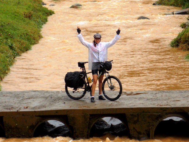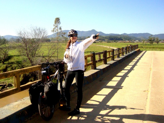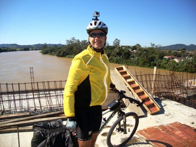 Neste dia chegaríamos até o rio Itajaí-Açu onde animadíssimos pegaríamos a balsa. Chegamos no local, avistamos a balsa do outro lado do rio, e nada. Ela continuou lá paradinha, e para a nossa surpresa a balsa estava desativada. A preocupação pegou. O jeito seria passar pela ponte, mas a ponte que liga Luiz Alves a Ilhota ainda estava sendo construída. Havia placas proibindo o acesso e muita gente trabalhando na obra. Então pensamos, vamos passar e torcer para que ninguém barre o nosso acesso. Se não pudéssemos atravessar a ponte em obras teríamos que mudar a rota e pedalar mais 40 Km passando pela cidade de Gaspar. Estávamos com fome e loucos para chegar. E já avistando o nosso destino, logo ali, não podíamos pensar em dar toda a volta por outro município. Fomos em direção a ponte em obras, levantando cordas que barravam o acesso, desviando placas, parando e ainda tirando fotos, afinal estávamos inaugurando a ponte, os cliques não poderiam ficar de fora. Passamos por um, dois, dez operários e para a nossa surpresa, apesar dos olhares curiosos sobre as bicicletas cheias de “muamba”, ninguém nos barrou. Entre pedaços de asfalto, ferros, madeiras, vãos onde se observava o rio logo abaixo de nós, atravessamos a ponte...ufa.